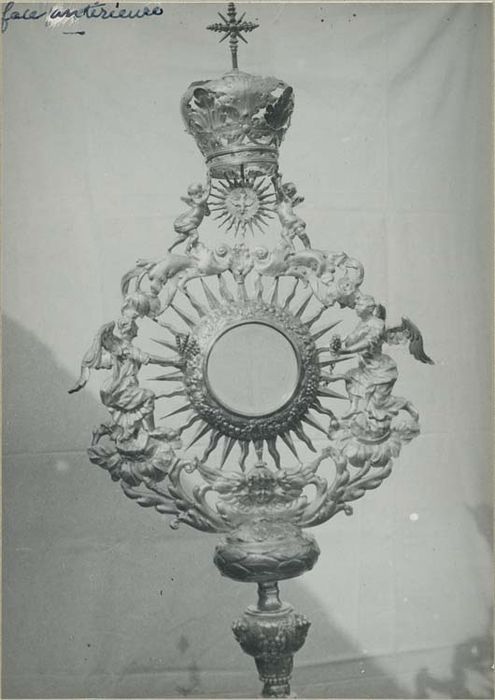 Pied en quadrilobe orné de têtes d'ange. La tige s'épanouit en deux branches où s'agenouillent deux anges. La couronne sur laquelle apparaît un disque solaire est soutenue par deux anges. Au centre : disque entouré de rayons.