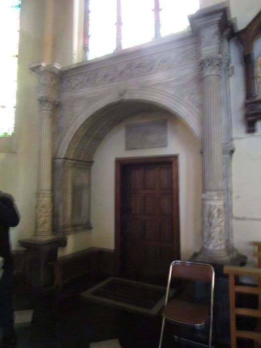 Architecture en marbre et en pierre de Tournai encadrant le tombeau de Gilles Ghiselin (mort en 1514), et d'Agnès Gommet, sa femme (morte en 1541). Il s'agit d'un petit arc de triomphe voûté de caissons, flanqué de colonnes cannelées et ornées de rinceaux. L'entablement est sculpté d'arabesques. Il y avait deux gisants aujourd'hui détruits.