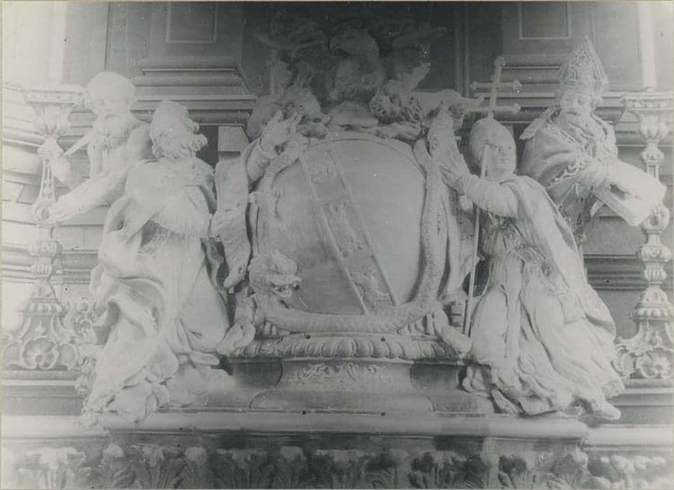 Tabernacle d'une forme peu commune : globe terrestre entouré des quatre pères de l'église latine (saint Hilaire. Saint Ambroise. Saint Jérôme. Saint Augustin).