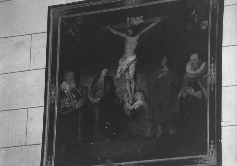 La crucifixion est une copie d’un tableau de Van Dyck de 1617-1619, vendue par Rubens en 1620 à la ville de Bergues et destinée à orner le maitre-autel du collège des Jésuites de la ville (Inv.1766 : https://collections.louvre.fr/ark:/53355/cl010066134).