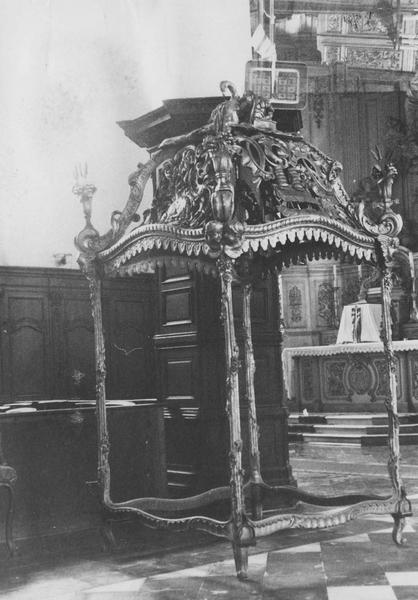 Au dessus des pieds : têtes d'angelots surmontées de vases, de grappes de raisin et d'épis de blés.