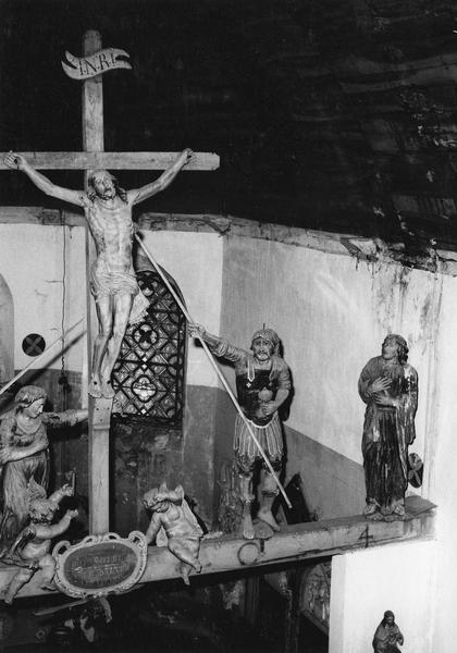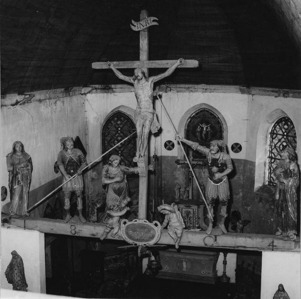 sur la poutre de gloire : statues de Marie de Magdala, la Vierge Marie, saint Jean et deux soldats qui entourent le Christ en croix