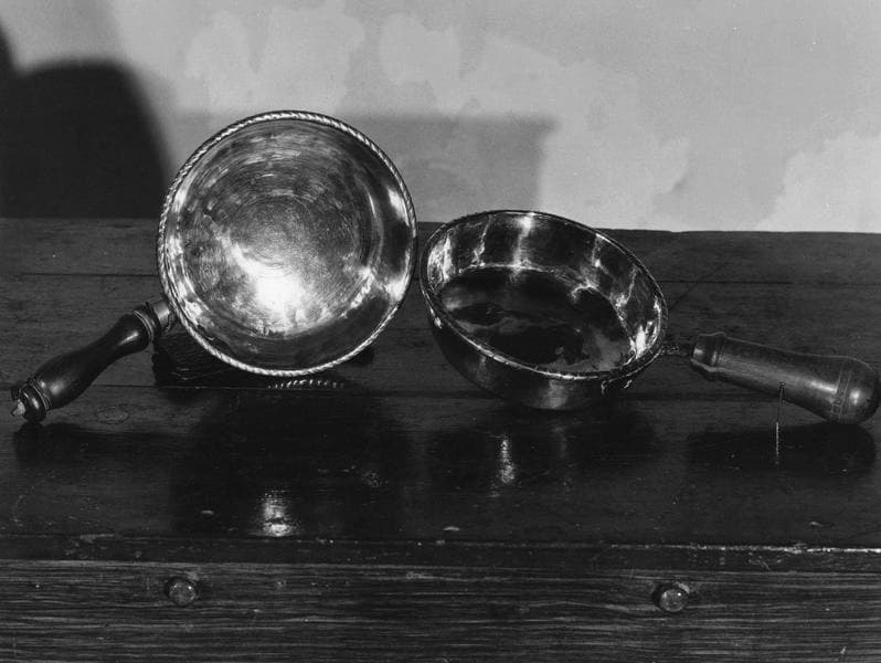 Récipient de forme circulaire. Manche en bois tourné avec soie en fer et clous de fixation en cuivre.