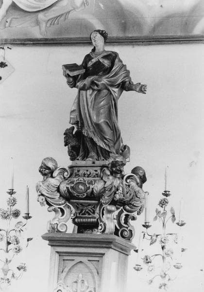 la sainte tient un livre ouvert dans la main droite et a le bras gauche ouvert. elle est posée sur un socle important orné à ses quatre angles d'anges ailés