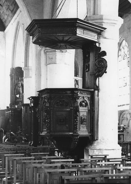 Cuve de plan hexagonal reposant sur un pied, escalier suspendu tournant à droite, dorsal encadré de 2 pilastres. Le ciel de l'abat-voix est recouvert de peinture bleue.
