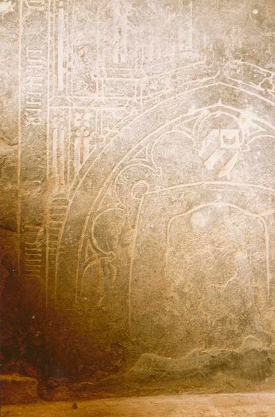 Dalle funéraire en pierre de Tournai représentant un homme et une femme sous un dais.