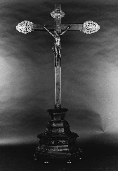 Croix et socle plaqués d'ébène et d'écaille de tortue. Figure du Christ en buis et ornements en argent repoussé fixés aux extrémités des branches de la croix, conservés au presbytère, dont il manque l'un des trois éléments.