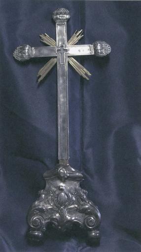 Croix-reliquaire en bois recouvert d'une feuille d'argent ; la relique est sous un cristal de roche ; les rayons sont en argent doré.