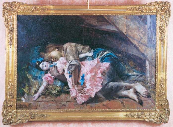 Huile sur toile représentant une petite fille endormie à même le sol, sur de la paille, tenant une grande poupée dans ses bras.