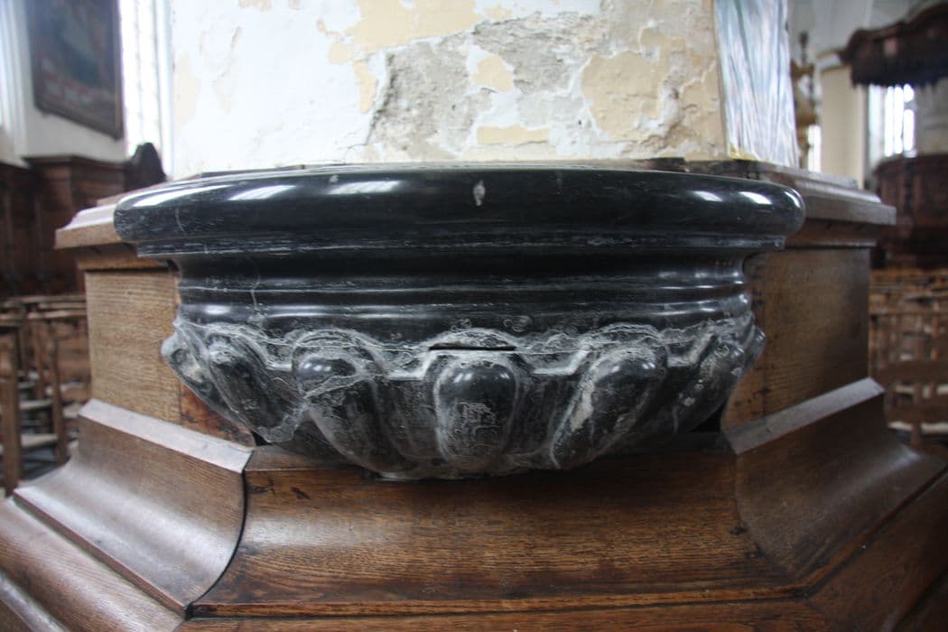 Un bénitier en marbre gris et l'autre, en marbre noir.