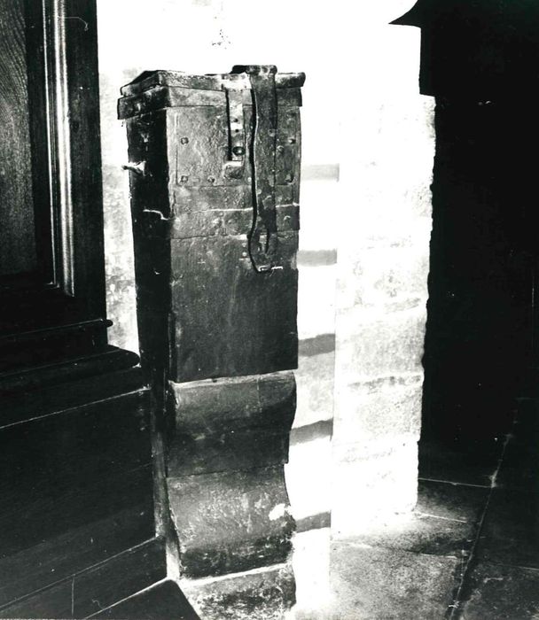 Bloc de bois renforcé de ferrures et serrure en fer.