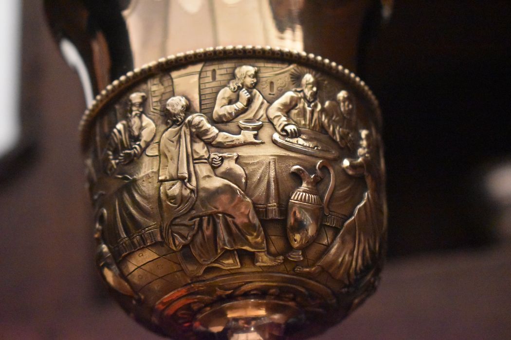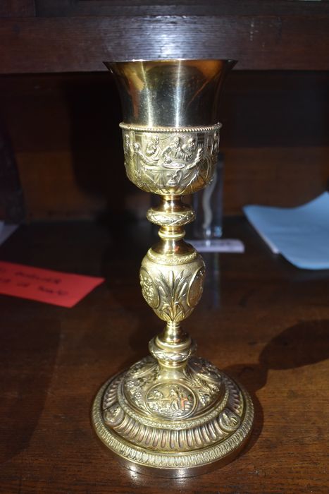 La Cène est représentée sur la coupe du calice et la Descente de croix (d'après Rubens), sur la patène.