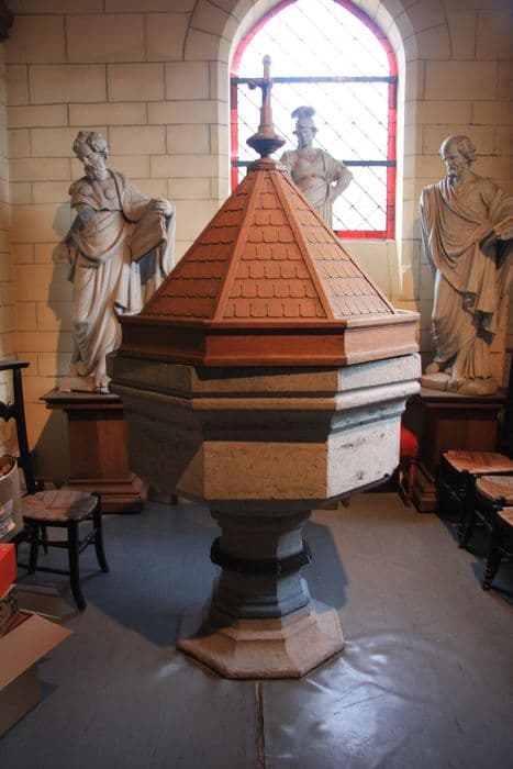 Fonts baptismaux en pierre de Soignies.