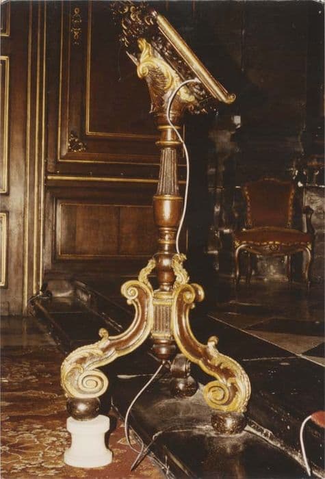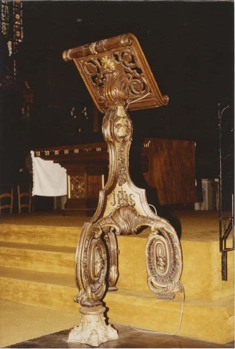 Lutrins abondamment ornés, en partie dorés. Ils reposent chacun sur trois pieds terminés par des volutes et des rinceaux ; le pupitre est ajouré.
