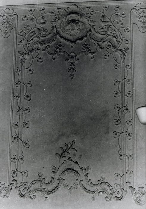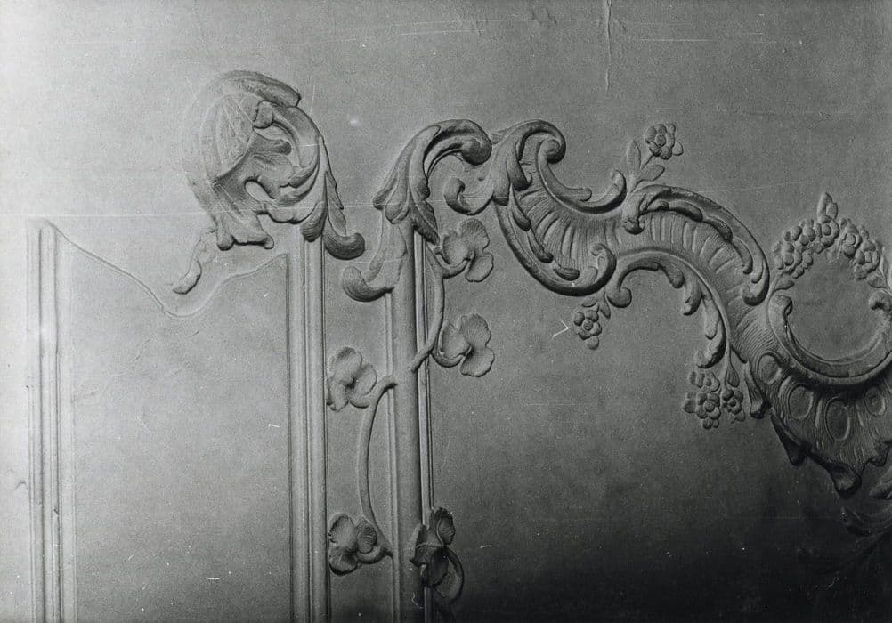 Décor de gypseries ornant le mur nord et trois coins du plafond de la grande salle du rez-de-chaussée de l'aile ouest.
