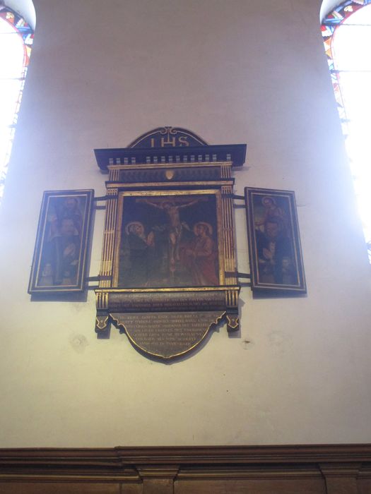 Christ en croix ; Vierge de douleur ; saint Jean l’Evangéliste ; saint André apôtre ; sainte : encensoir ; homme : en donateur ; femme : en donateur