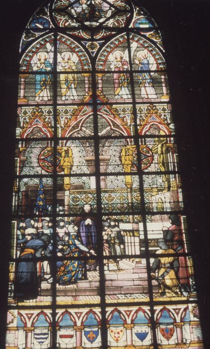 Les vitraux illustrent la bataille de Bouvines, où Philippe-Auguste fut victorieux des coalisés.
