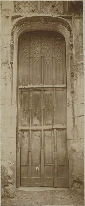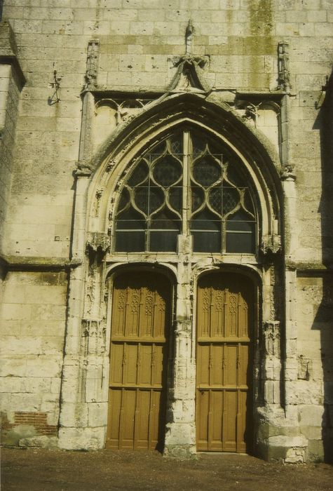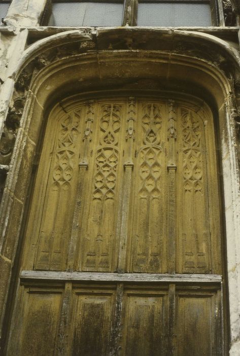 Chacun des deux vantaux de porte est divisé en trois registres séparés par des montants horizontaux. Chacun de ces registres est divisé en quatre panneaux séparés par des montants verticaux quadrangulaires à décor de pinacles gothiques montant de fond depuis le bas de la porte jusqu'à son sommet. Le sommet de chacun des vantaux est en anse de panier. Les panneaux des deux registres inférieurs sont sans décor. Les panneaux des registres supérieurs des deux vantaux, très hauts, sont décorés de réseaux flamboyants composés de mouchettes formant des compositions diverses. A ce niveau, les montants verticaux de la porte sont couronnés de pinacles.