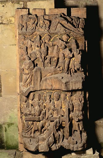 chêne : taillé, poli, peint, décor en bas relief