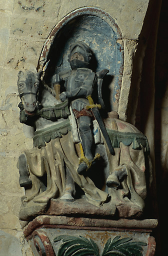 La statue du saint Georges équestre du 15e siècle est présentée en niche sur une console.