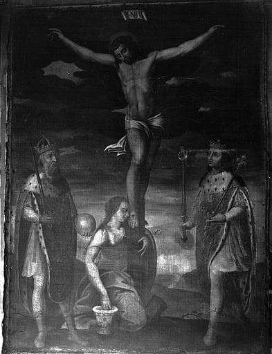 tableau : le Christ en croix entre saint Charlemagne et saint Louis