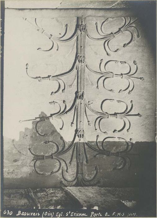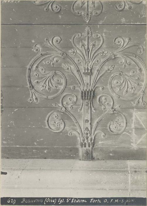 Le portail occidental de l'église Saint-Etienne de Beauvais est postérieur à la construction de sa nef et de sa façade occidentale. Une étude stylistique a permis à Annie Henwood-Reverdot de dater le portail dans son état premier dans les années 1220-1225. Les portes ont probablement été mises en place dès ce moment puisque leur structure s'adapte à la forme initiale du portail à trumeau et linteau droit. Il a par la suite été remanié (au 16e siècle ?). Deux arcs brisés ont été mis en place sous le linteau, les piédroits et le trumeau ont été modifiés. Les pentures supérieures des deux vantaux de la porte ont été partiellement dissimulées à la suite de ces transformations.