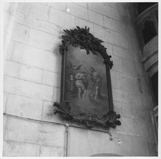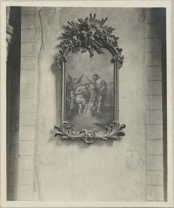 Ce cadre rectangulaire entoure une toile du 19e siècle représentant le Baptême du Christ. Sa partie inférieure est décorée de deux palmes placées de part et d'autre d'une coquille Saint-Jacques. Sa partie supérieure est sculptée de trois têtes d'angelots placés dans des nuées et dans une gloire.