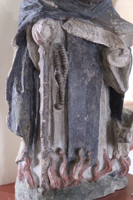 Manquent la main gauche et plusieurs fragments du manteau. Epaufrure sur la tête du cochon. Traces de polychromie ancienne.