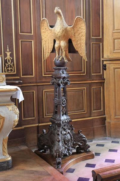 Le lutrin se compose d'un pied posé sur des lions couchés. Ce pied est orné d'un riche décor sur chacune de ses faces : une harpe avec des rameaux et un ruban, un instrument à vent, un triangle et un ruban, enfin sur la troisième face, une flûte, une partition de musique et un ruban. Au-dessus, le support est constitué de trois montants réunis par une rose sculptée. L'aigle pupitre, aux ailes déployées monté sur une sphère et regardant droit devant lui, achève la composition.