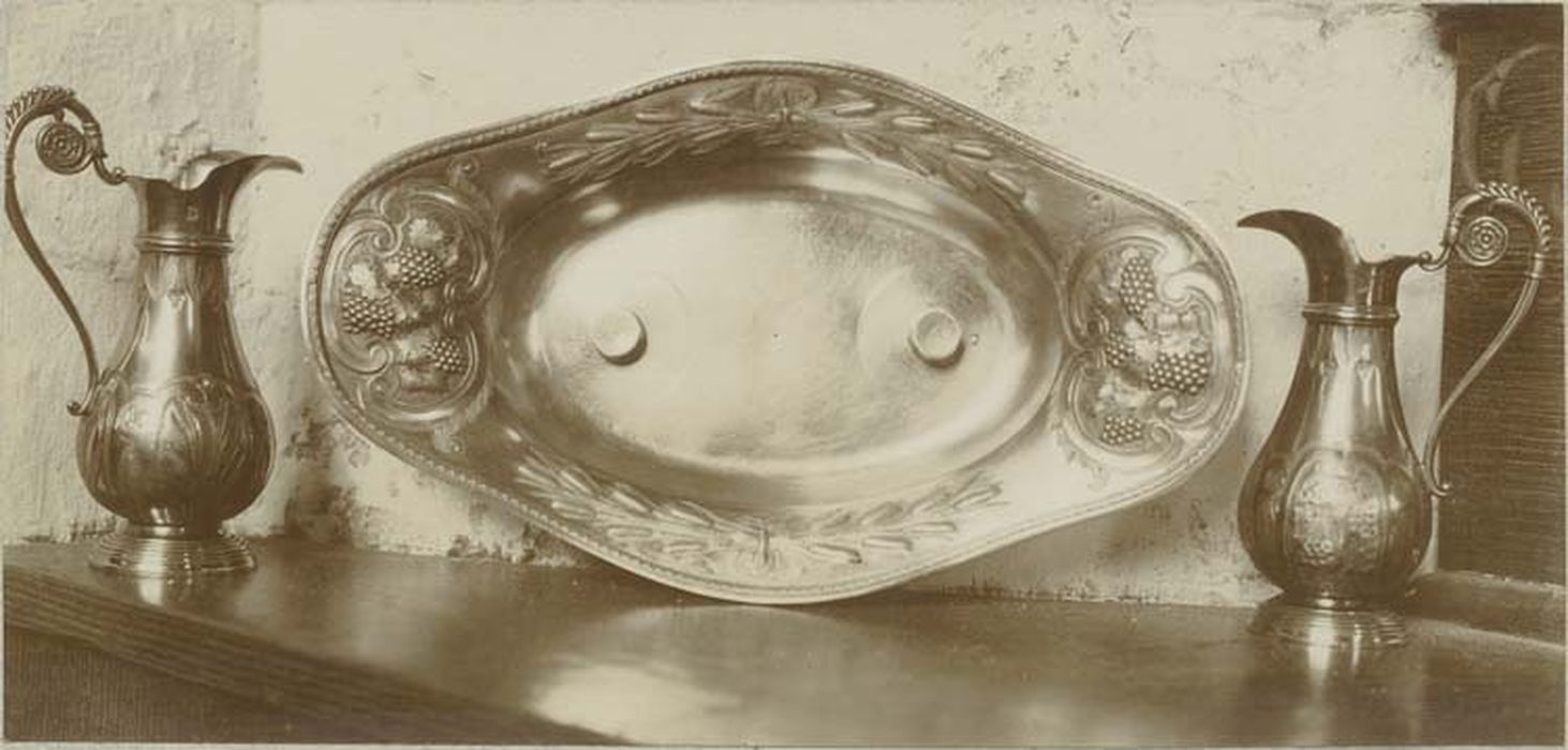 Le calice est en vermeil. Son pied est orné d'oves, de rinceaux, de palmes et de feuilles de vigne, d'épis de blé et d'une croix. Son pied est décoré d'un épis de blé, d'une grappe de raisin. La patène porte pour seul décor le monogramme du Christ. Les deux burettes sont décorées en creux pour l'une de palmes et de roseaux, et pour l'autre de vignes avec des grappes de raisin. Le plateau est orné de pampres de vignes et de roseaux.