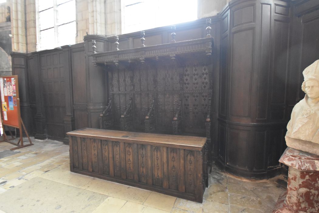 Le banc est daté de 1587. Le décor du banc d'oeuvre (gourdes, besaces, panetières) s'accorde bien avec son emplacement dans l'église Saint-Jacques. Sa décoration est empruntée au vocabulaire de la Renaissance et aussi au vocabulaire gothique (remplages de la partie antérieure du banc).