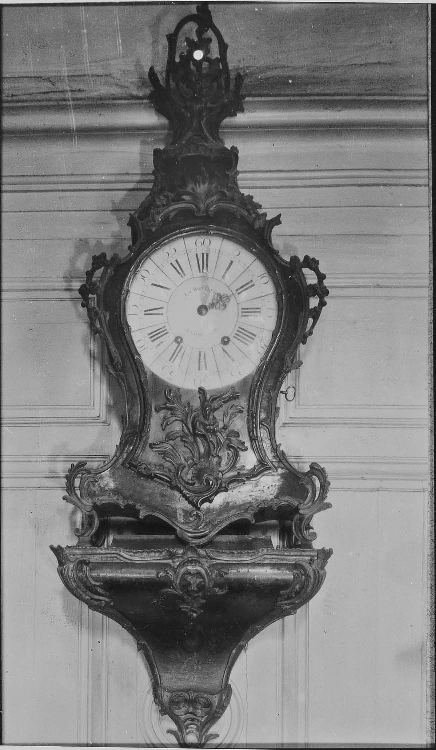 Le cartel et le socle sont stylistiquement homogènes. Le style rocaille du décor autorise à dater l'oeuvre du milieu du 18e siècle. Le cadran porte l'inscription Le Brasseur à Compiègne.