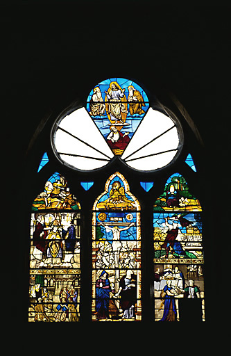 Lancette de gauche, registre inférieur : messe de saint Martin ; 2e registre : consécration de saint Martin ; amortissement : charité de saint Martin. Lancette du milieu : Crucifixion ; amortissement : pélican mystique. Lancette de droite, registre inférieur : Festin d'Hérode, 2e registre : Sacrifice d'Abraham ; amortissement : Agar et Ismaël. Tympan : Transfiguration.