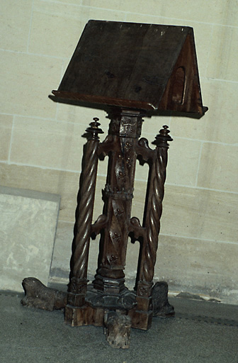 Oeuvre du 1er quart du 16e siècle par le style et le F couronné de François 1er. Ce lutrin fut transformé, ou plutôt complété d'un aigle de saint Jean monté sur le globe. Cet élément porte la date de 1636. Il est niché à l'intérieur du double pupitre.