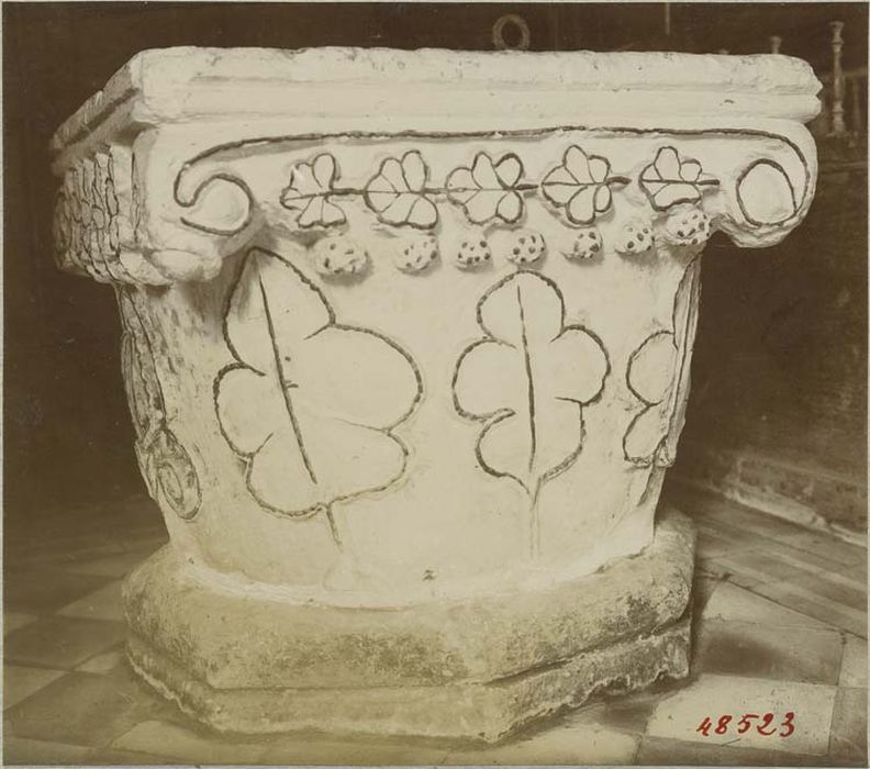 Sous le tailloir court une frise de feuilles polylobées et de grappes de raisins.