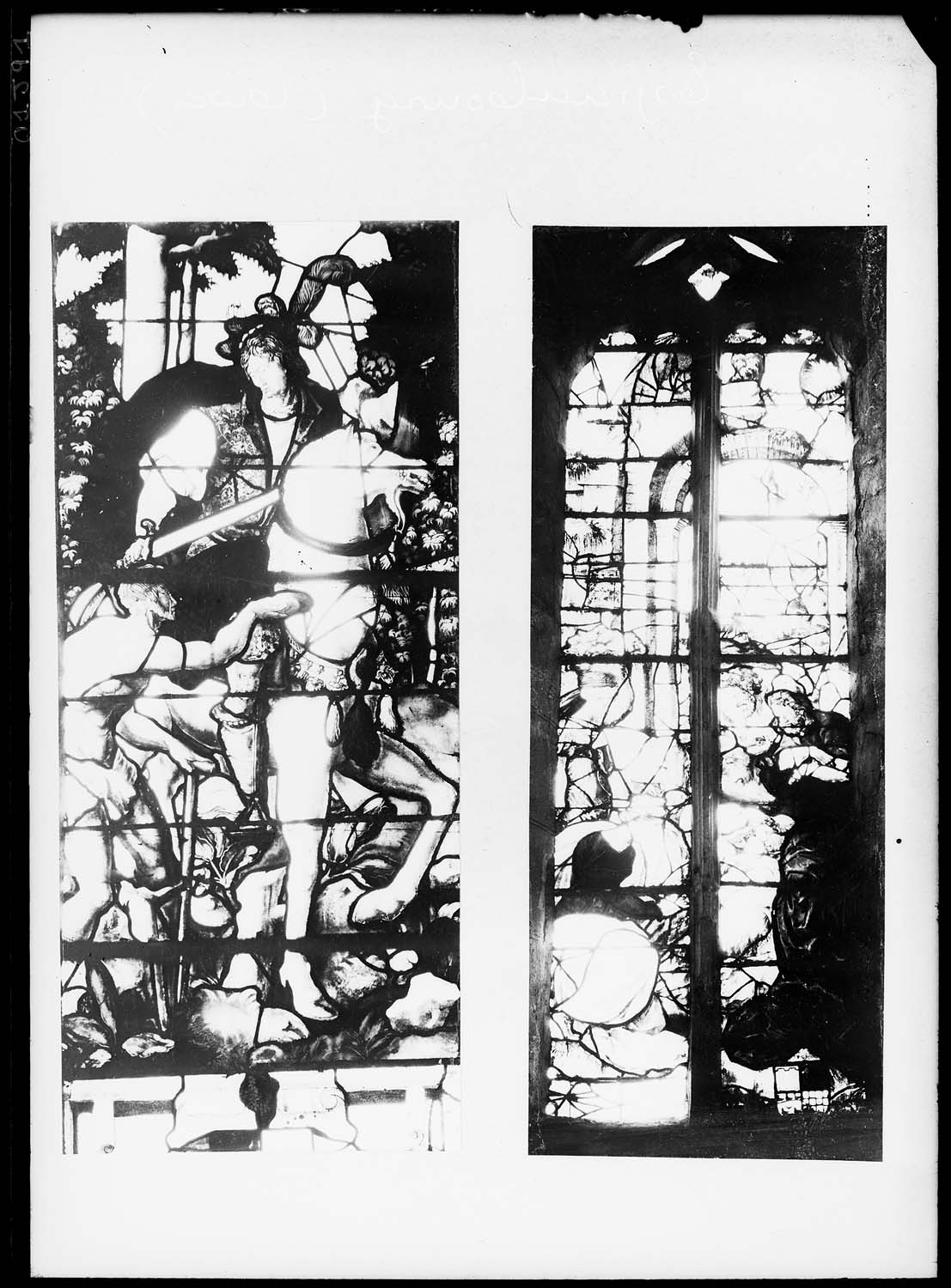 Vitraux en verre coloré, peint avec grisaille et jaune d'argent. Baie 0 : verrière composée de deux lancettes trilobées surmontées d'un quadrilobe. Baie 1 : composée de deux lancettes trilobées avec tympan ajouré.