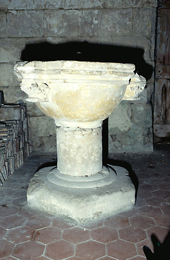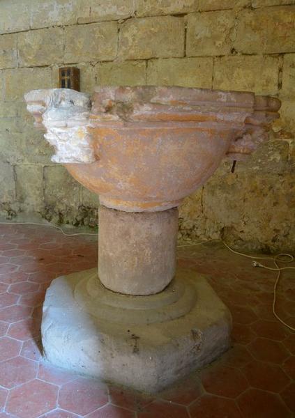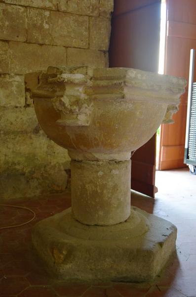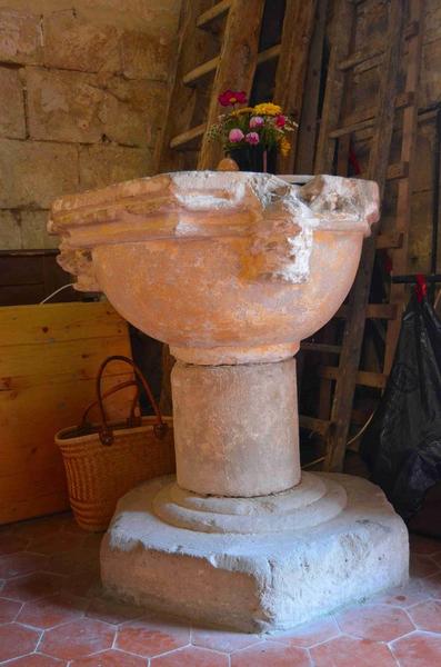 Les fonts baptismaux sont en pierre sculptée. Ils se composent d'une base hexagonale, d'un pied cylindrique assez court et d'une cuve circulaire surmontée d'un rebord mouluré de trois tores séparés par deux gorges, rebord qui se prolonge en tailloir pour trois chapiteaux accolés à la cuve (taillés dans le même bloc).