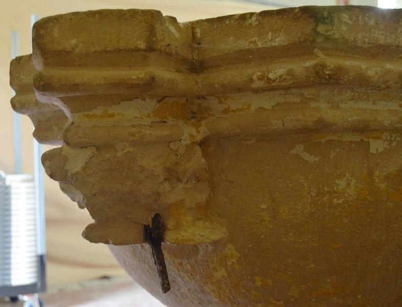 Il manque la base et le fût des trois colonnettes. Le pied actuel et sa base sont d'un calcaire plus gris que la cuve, et sont certainement rapportés.