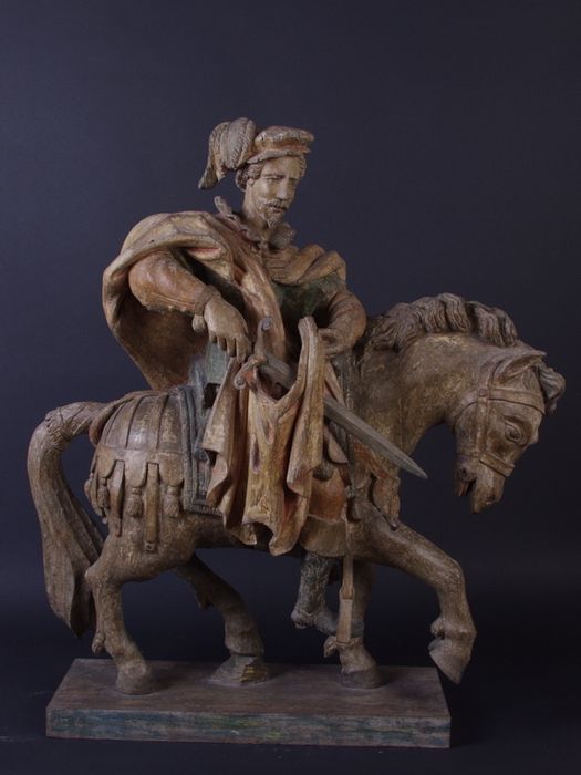 Oeuvre restaurée en 1961. Polychromie complétée. Tête et jambes du cheval consolidées. La figure du gueux est absente.