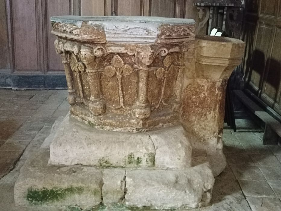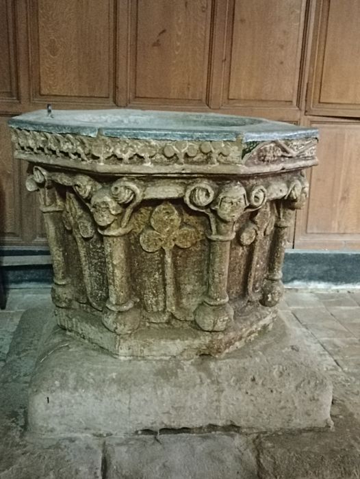 Fonts baptismaux octogonaux en pierre taillée, sculptée de bas-reliefs et peinte, avec une seule cuve doublée en plomb. Ils sont placés sur une base en pierre de plan carré avec deux marches contre l'une des faces de la cuve, une seconde cuve, plus petite a été plaquée. Elle repose sur un support de plan quadrangulaire et la cuve elle-même est octogonale.