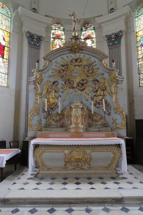 L'autel est galbé, décoré sur sa face antérieure de l'Agneau sur le livre aux sept sceaux placé dans un cadre constitué de deux palmes nouées. Des coquilles sont placées dans les angles galbés de l'autel. La porte du tabernacle est décorée d'un aigle nourissant ses oisillons, l'une des faces latérales, d'épis de blé et l'autre de grappes de raisin. Des têtes d'angelots ailés en ronde bosse en occupent les angles. Le sommet est couronné d'une croix. Le retable est décoré sur sa face de deux anges agenouillés sur des nuages argentés. L'ange de droite a les mains jointes en prière, l'autre ramène ses mains croisées sur sa poitrine. Leurs vêtements et leurs ailes sont dorés. Les deux anges entourent une gloire rayonnante décorée de têtes d'angelots ailées groupées deux par deux. Au sommet de la composition, une rocaille et une statuette de Christ sur un globe. Il bénit de sa main droite levée et tient la croix de sa main gauche.