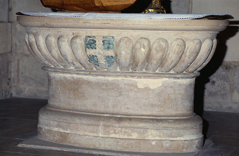 Fonts baptismaux en pierre sculptée composés d'une cuve ovale décorée de godrons et de deux écus armoriés, reposant sur un support monopode ovale lui même établi sur une base moulurée. Les fonts sont constitués de deux éléments de pierre, la cuve d'une part et le support avec sa base d'autre part.