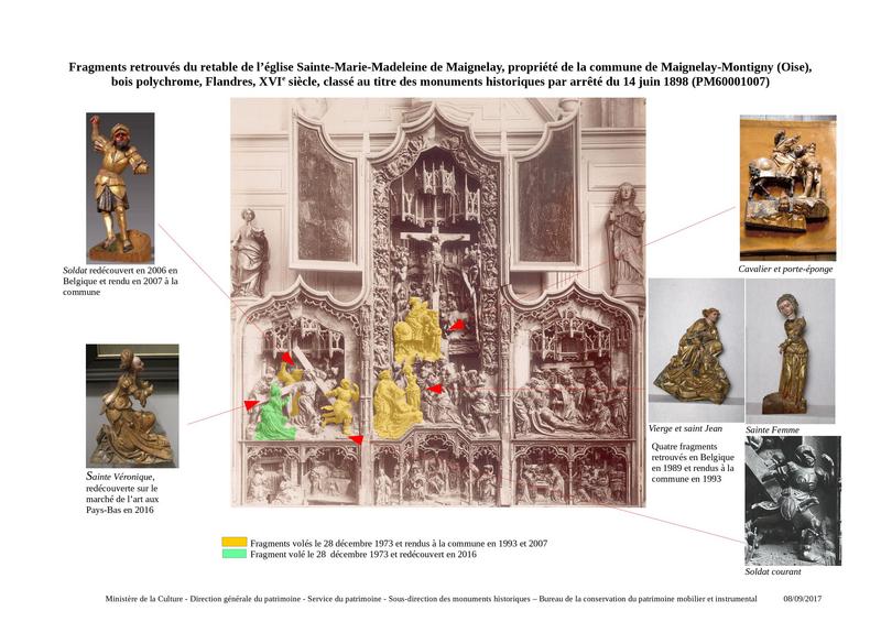 Oeuvre volée dans la nuit du 27 au 28 décembre 1973, à l'exception de la caisse et des volets peints de la partie supérieure (voir cliché du service de l'inventaire général). Quatre fragments (scène du Portement de Croix: 'soldat courant' devant le Christ - scène de la Crucifixion : cavalier et porte-éponge, saint Jean et la Vierge, sainte femme) ont été retrouvés et restitués à la commune en juin 1993. En janvier 2006, le soldat du Portement de Croix, derrière le Christ, est identifié sur la foire des antiquaires de Bruxelles : il est restitué à la commune en mars 2007. Les fragments retrouvés sont en dépôt au musée départemental de l'Oise à Beauvais.