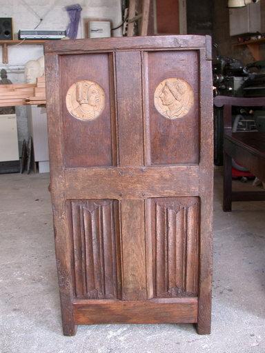 Les personnages de profil dans les médaillons et les plis de serviette se trouvent sur les meubles de la première Renaissance et permettent de dater ces bancs vers 1520-1530.
