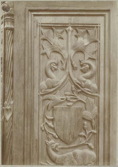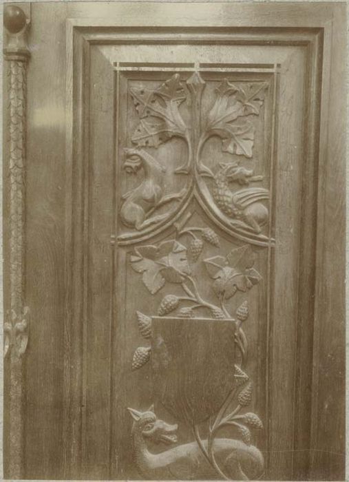 ornementation (animal fabuleux, oiseau, écu, arc, fleuron, vigne : feuille, raisin, trèfle, chardon, noisette)