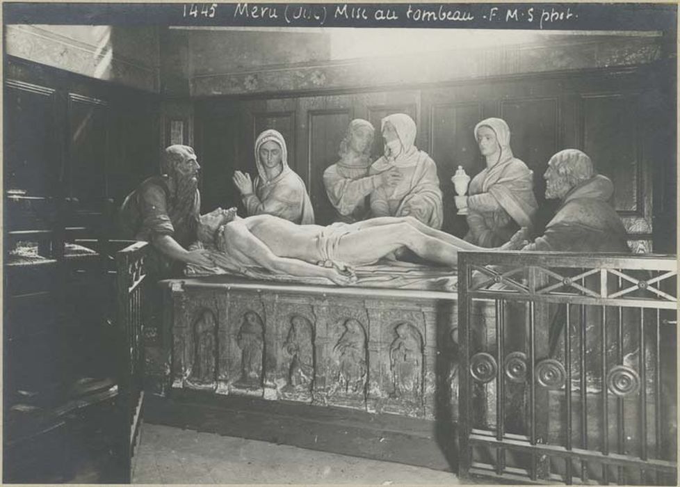 La Mise au Tombeau provient de la chapelle sépulcrale de Ferry d'Aumonts. Elle a été mutilée sous la Révolution et fortement restaurée puisqu'entièrement reconstituée vers 1870 avec des éléments hétérogènes. Toutes les têtes détruites à la Révolution ont été refaites à la fin du 19e siècle, après 1870. Le devant du sépulcre n'appartient pas à l'ensemble de la Mise au Tombeau, il a été rapporté. Cette Mise au Tombeau est incomplète puisqu'elle ne comporte que sept figures, celle d'une sainte femme manque. Le thème de la Mise au Tombeau du Christ s'est répandu en Ile-de-France par la vallée de l'Oise en venant du Nord. Le département de l'Oise en possède aujourd'hui huit, toutes postérieures au 1er quart du 16e siècle. Elles ont été produites par des ateliers locaux marqués par des influences picardes et flamandes. Les figures sont travaillées en pied au contraire des personnages des Mises au Tombeau picardes et flamandes. La Mise au Tombeau de Méru présente un innovation existant aussi dans le Sépulcre de Puiseaux dans le Loiret datée du 1er quart du 16e siècle, il s'agit des figures agenouillées des ensevelisseurs. La figure de la Vierge a été retaillée dans le dos comme pour l'adapter à un emplacement précis.