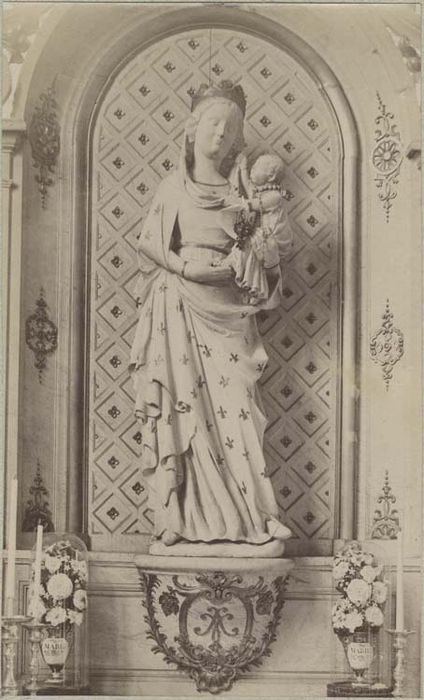 La statue est recouverte d'un épais repeint blanc fleurdelysé. La pierre se fend (manteau et main de la Vierge). Les fleurons de la couronne ont été tronqués. Des reprises maladroites ont été effectuées en plâtre, notamment dans le visage de la Vierge et sur son manteau. Sous l'enduit subsistent des traces de polychromie.