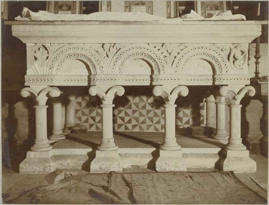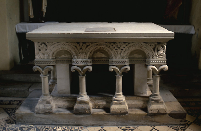 La table est ornée d'arcades en plein cintre avec motif de billettes et décor végétal dans les écoinçons.