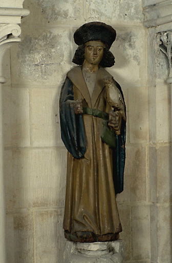 Cette statue date de la 1ère moitié du 16e siècle. Elle représente saint Thibault (1017-1066), fils du comte de Champagne. Après avoir été moine à Saint-Remi de Reims, il devint pèlerin puis ermite à Pettingen (Pétange) au Luxembourg. Il se fixa ensuite en Italie, près de Vicence et fut ordonné prêtre. Il rejoignit les camaldules peu avant sa mort et fut canonisé par Alexandre III en 1073. Les principaux lieux de culte qui lui sont consacrés sont : Saint-Thibault-en-Auxois (où deux de ses cotes étaient conservées), Joigny, Saint-Thibault-des-Vignes et Thann (où était conservé un pouce du saint).