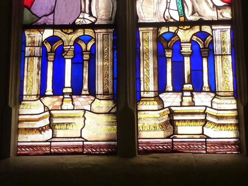 verre transparent (coloré) : peint, grisaille sur verre, jaune d'argent ; plomb : réseau